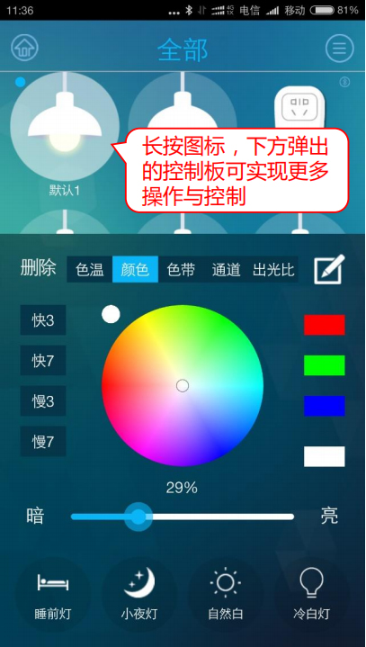 藍(lán)牙(Bluelooth)無線自組網(wǎng)技術(shù)實(shí)現(xiàn)互聯(lián),設(shè)備與設(shè)備之間級(jí)聯(lián),實(shí)現(xiàn)不受限的網(wǎng)絡(luò)覆蓋范圍。這是一種基于藍(lán)牙的無線智能照明控制系統(tǒng),其包括智能照明設(shè)備、無線控制設(shè)備及可控制、配置該照明控制系統(tǒng)的移動(dòng)端APP軟件。