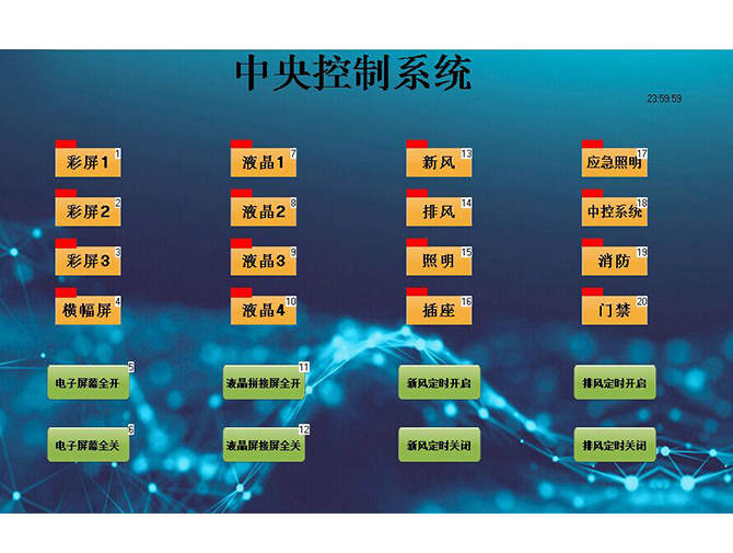 該項目采用VSU總線型智能照明控制系統(tǒng),網(wǎng)關(guān)主機,電源模塊,級聯(lián)模塊,串口模塊加觸摸屏控制??赏ㄟ^中控觸摸屏一鍵控制電子屏幕、液晶拼接屏、新風(fēng)定時、排風(fēng)定時等。