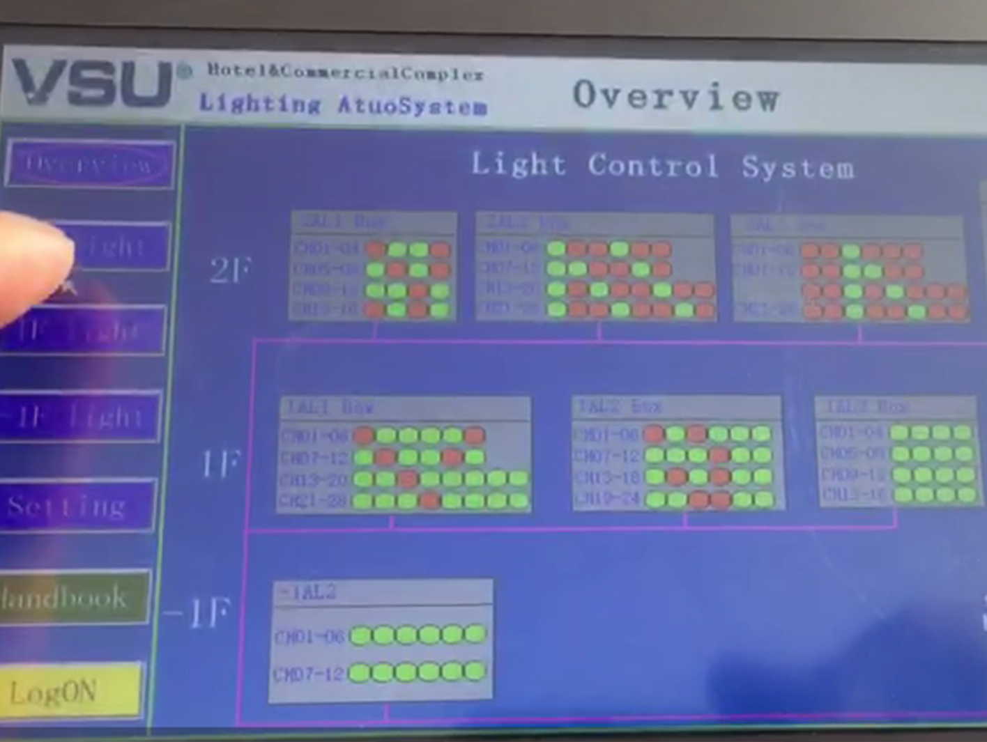 上圖為項(xiàng)目現(xiàn)場內(nèi)的電箱圖片,產(chǎn)品采用導(dǎo)軌式安裝,安裝簡單,普通電工即可完成。通過現(xiàn)場的觸摸屏可對控制終端任意操作,語言選擇中文/English,燈具單控全控,遠(yuǎn)程操控。并且可以將建筑內(nèi)的燈具開關(guān)狀態(tài)了如指掌,避免疏忽管理,導(dǎo)致電能耗上升情況的發(fā)生。