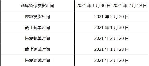 關(guān)于2021年春節(jié)期間倉庫暫停發(fā)貨及項目調(diào)試暫停通知