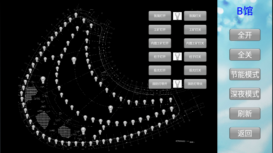 根據(jù)夏日晝長夜短、冬日晝短夜長的氣候特點以及開館、閉館的時間,預(yù)設(shè)燈光自動亮起、關(guān)閉的時間,避免忘關(guān)、漏關(guān)等現(xiàn)象;深夜客流量少時根據(jù)部分場館的需求可預(yù)設(shè)其所需的亮度(如下圖:深夜模式)