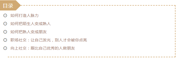 你認(rèn)識誰比你知道什么更重要,愿意為你搭橋、為你背書、助你成功這才是真正有意義的人脈。保有一顆孩童般的好奇心,對世界、對他人真正的感興趣,渴望通過人和人的交往看到更廣闊的的世界,通過對人的深入了解而認(rèn)識他們的本真。真誠、溫暖是敲門磚。把你的真誠用言語、行動,傳達(dá)給對方,讓對方感受到你的光和溫度,被你吸引。為他人創(chuàng)造價(jià)值是引路燈,做事絕不要從利己和功利的角度出發(fā),而是首先想到如何為對方創(chuàng)造價(jià)值。