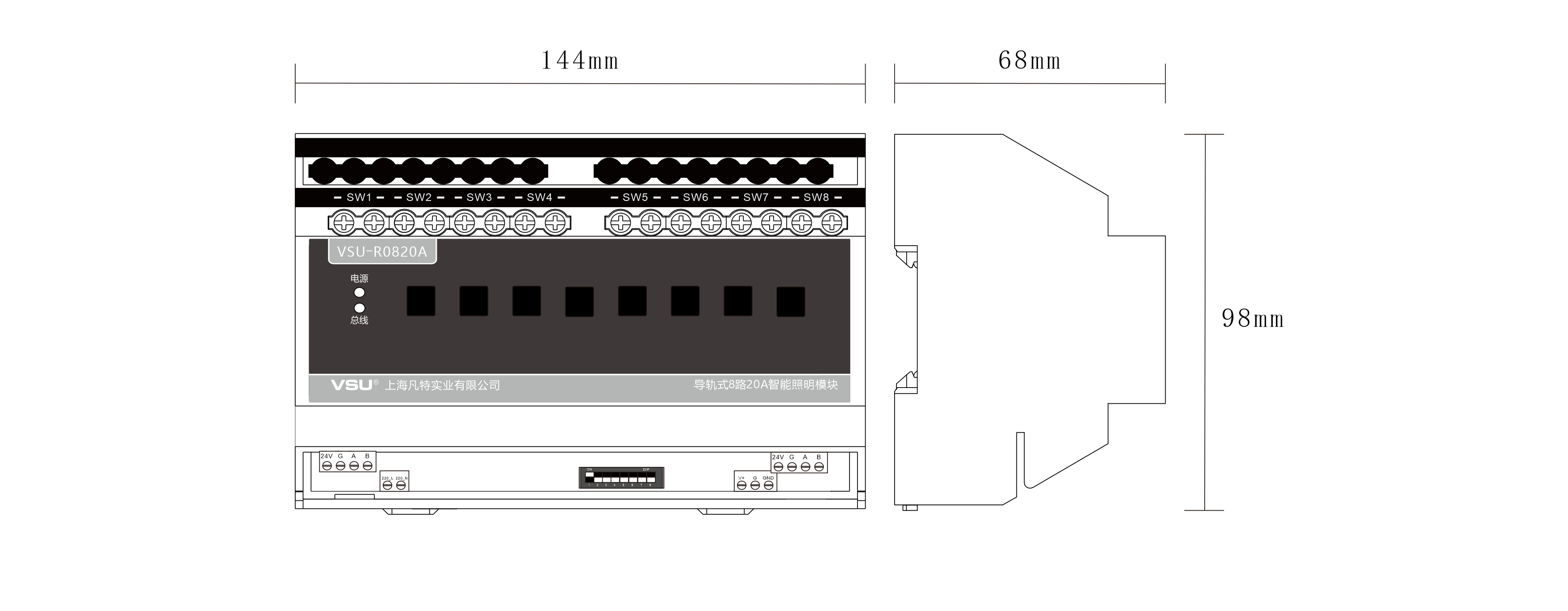 1,標(biāo)準(zhǔn)導(dǎo)軌式安裝占8個(gè)模數(shù)位;