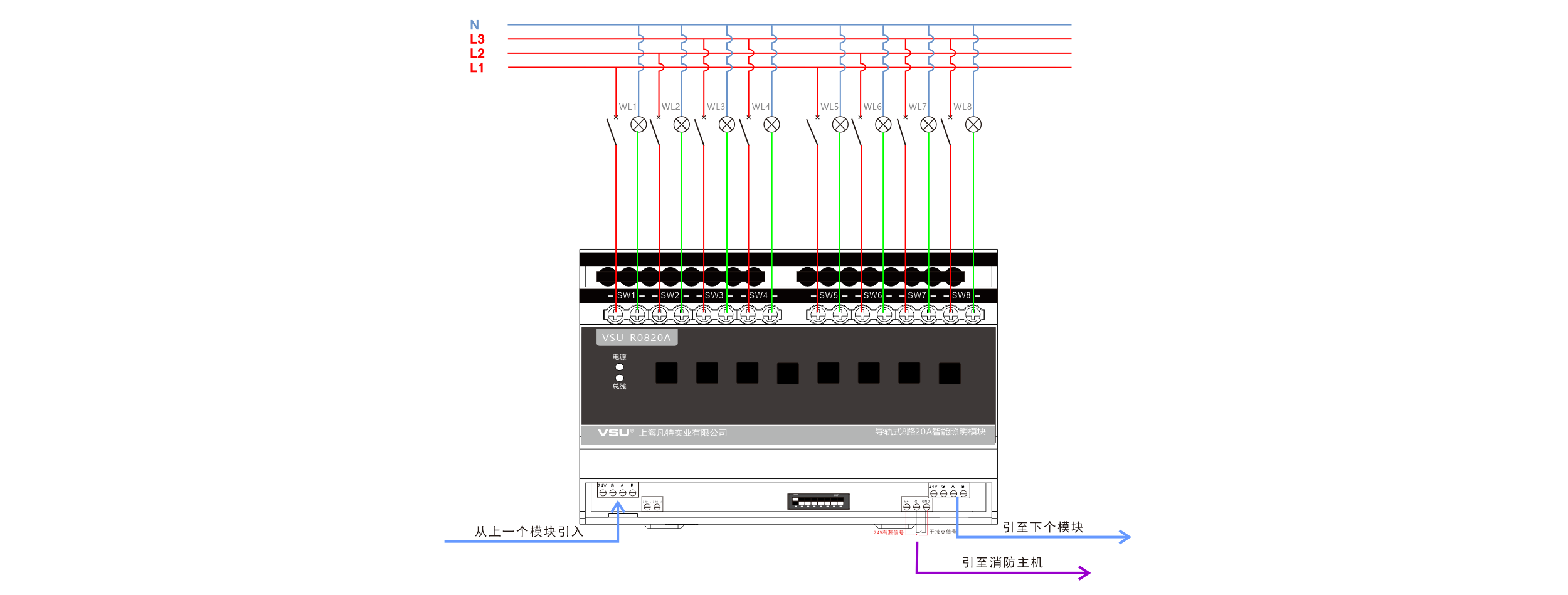 本產(chǎn)品為導(dǎo)軌式安裝,含8路智能繼電器,每回路可獨(dú)立控制4400W燈具的開(kāi)關(guān),帶應(yīng)急按鍵,LED燈時(shí)時(shí)指示各個(gè)回路開(kāi)關(guān)狀態(tài),可設(shè)置為互鎖控制4組窗簾開(kāi)合;