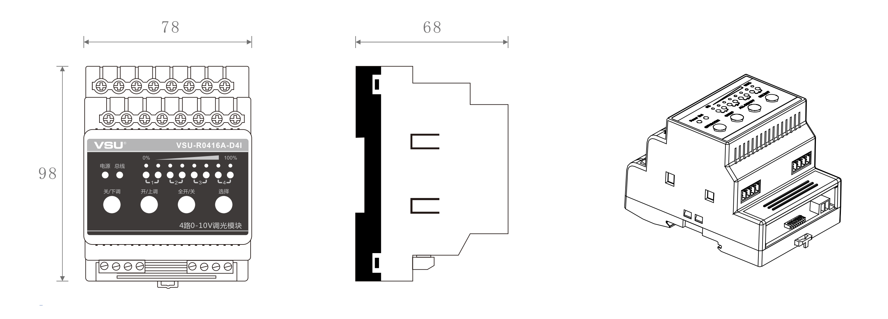 本產(chǎn)品為導軌式安裝,含4路智能繼電器可獨立控制4路3300W燈具的開關(guān),4路0-10V調(diào)光接口配合0-10V調(diào)光變壓器可對日光燈、LED燈等燈具調(diào)光; |