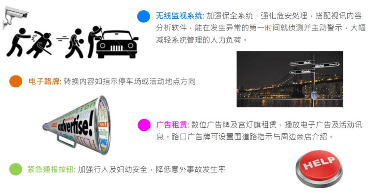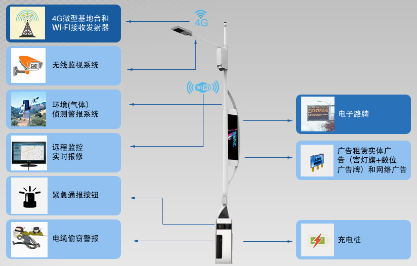 智慧路燈桿是一種集成各種信息設(shè)備技術(shù)創(chuàng)新復(fù)合應(yīng)用的智慧路燈產(chǎn)品,整個(gè)智慧燈桿內(nèi)包含路燈照明控制系統(tǒng)、WIFI天線基站、視頻監(jiān)控管理、廣告屏播控系統(tǒng)、城市環(huán)境實(shí)時(shí)監(jiān)測、緊急呼叫系統(tǒng)、水位監(jiān)測、充電樁系統(tǒng)和井蓋監(jiān)測系統(tǒng)等應(yīng)用。